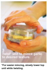 1. For easy mincing, keep the two halves of the Garlic Twist slightly apart while twisting it back-and-forth. This would allow the garlic to be shredded layer-by-layer. If done properly, the Garlic Twist would enable garlic to be minced with minimal effort.