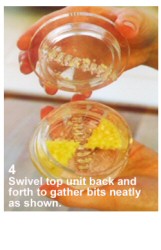2. For quick and neat gathering of the minced garlic, twist the top half to one direction until considerable resistance is felt, then back-twist it to the other direction until considerable resistance is again felt, then back-twist it again very slightly to push minced garlic to the center completely free of the mincing teeth before opening.